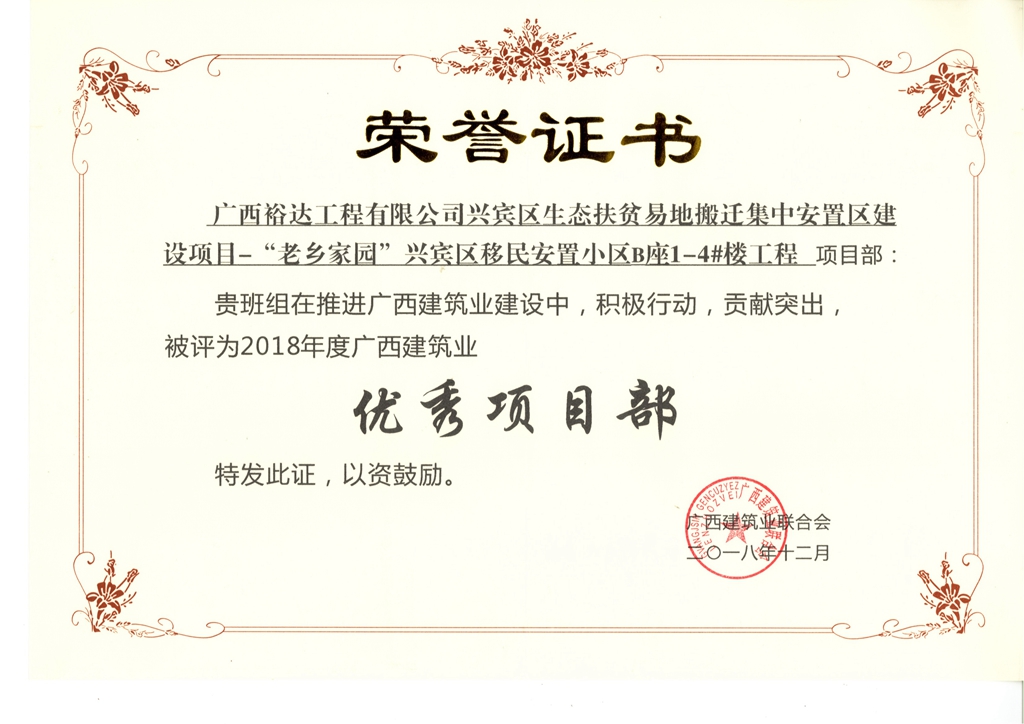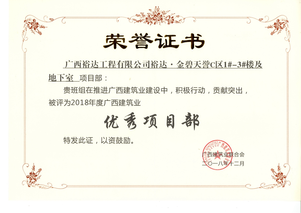 近日,從廣西建筑業(yè)聯(lián)合會(huì)獲悉,廣西裕達(dá)工程有限公司“老鄉(xiāng)家園”興賓區(qū)移民安置小區(qū)B座1-4#樓工程和裕達(dá)·金碧天譽(yù)C區(qū)1#-3#樓及地下室工程榮獲“2018年度廣西建筑業(yè)優(yōu)秀項(xiàng)目部”稱號(hào),陳鑫、覃登年、陳慶策、周亞、覃小廣、朱文、肖文、陸麗玲、黃雄光、譚春艷、羅雪梅、莫馥甄、陳國(guó)錢(qián)、何壽恒、李奇茂、鄭曉娟、盧洋、蔣德榮、梁海云、龍永等20位員工獲得“2018年度廣西建筑業(yè)優(yōu)秀從業(yè)人員”稱號(hào)。