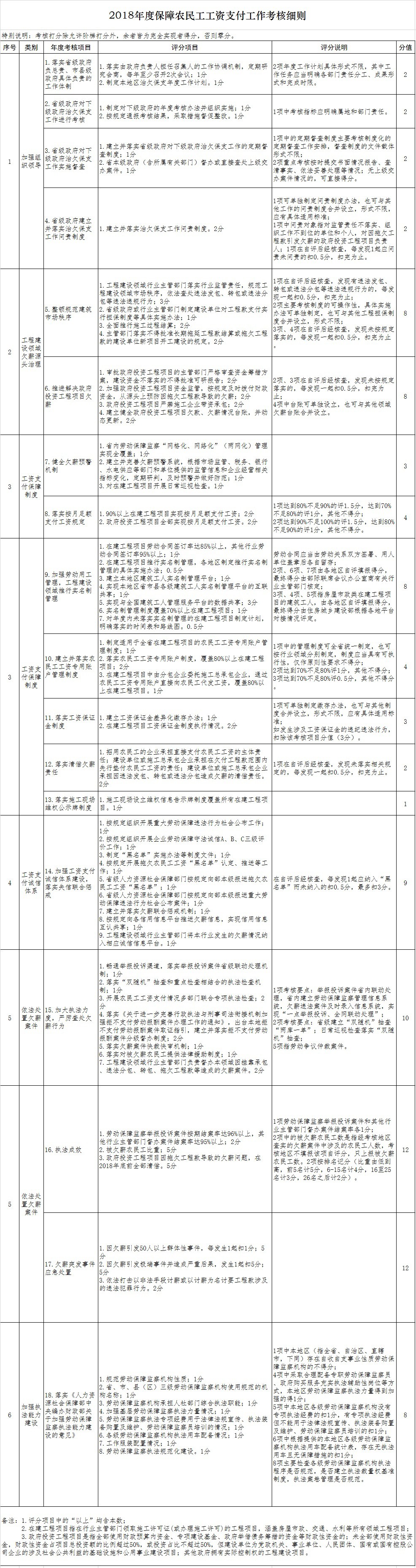 據(jù)部際聯(lián)席會議辦公室負(fù)責(zé)人介紹,今年的《考核細(xì)則》共有考核指標(biāo)65項,分為加強(qiáng)組織領(lǐng)導(dǎo)、工程建設(shè)領(lǐng)域欠薪源頭治理、工資支付保障制度、工資支付誠信體系、依法處置欠薪案件和加強(qiáng)執(zhí)法能力建設(shè)等5個方面?!犊己思?xì)則》將繼續(xù)堅持目標(biāo)導(dǎo)向、問題導(dǎo)向和結(jié)果導(dǎo)向,突出年度考核重點,注重考察治理欠薪實效。根據(jù)2017年度考核實施情況并結(jié)合各地區(qū)保障農(nóng)民工工資支付工作形勢,部際聯(lián)席會議在《考核細(xì)則》中,重點加強(qiáng)了對落實主管部門特別是工程建設(shè)行業(yè)主管部門責(zé)任、強(qiáng)化對欠薪失信企業(yè)信用懲戒以及推進(jìn)落實工資支付保障制度的考核力度,加大相關(guān)項目的分值權(quán)重,充分發(fā)揮考核的正向?qū)蜃饔?,指?dǎo)和督促各地區(qū)嚴(yán)格落實屬地監(jiān)管責(zé)任,確保黨中央、國務(wù)院的關(guān)于保障農(nóng)民工工資支付的各項工作部署能夠真正落實落地。