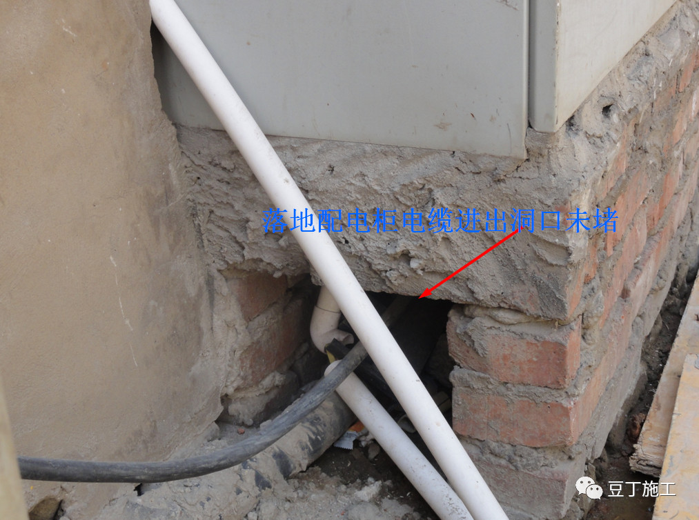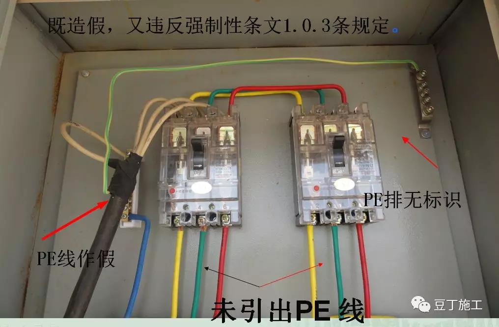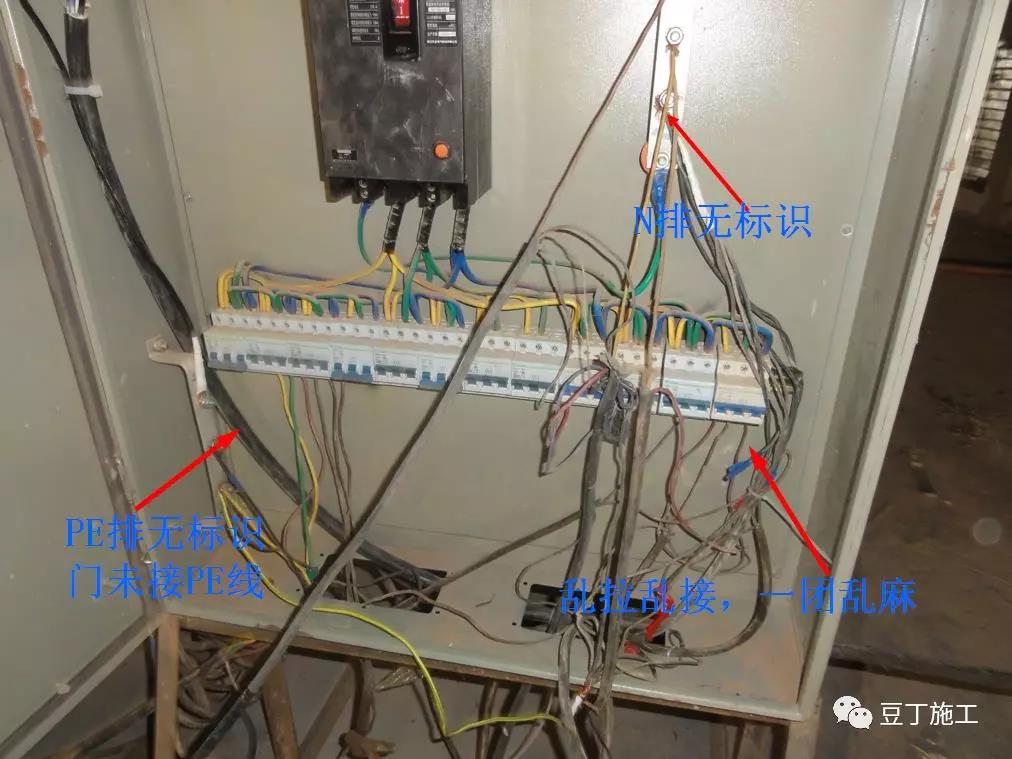 9、PE線、N線從開關(guān)箱內(nèi)引出不規(guī)范。不是按要求從PE、N端子板引出,而是象蜘蛛網(wǎng)一樣互相繞接后引出,亂拉亂接。違反強制性條文8.1.11條規(guī)定。