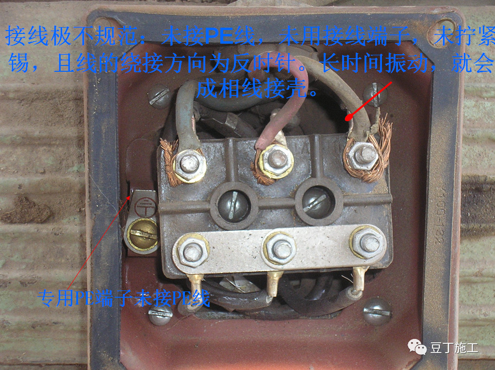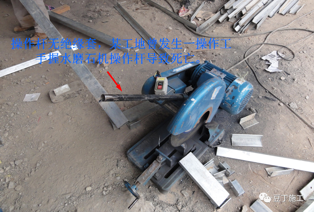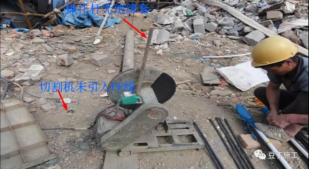 3、施工現(xiàn)場的施工機具,如電焊機、對焊機、碘鎢燈等外殼不接PE線;鋼筋彎曲機、鋼筋剪切機、切割機、臺鉆、打氣泵等電動機的接線盒內(nèi)的專用PE端子95%以上不接PE線,而且多數(shù)的操作把手無絕緣套。這是最普遍、最嚴(yán)重地違規(guī)。