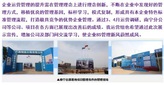 通過運(yùn)營(yíng)調(diào)研,調(diào)研雙方依據(jù)8S現(xiàn)場(chǎng)管理方針進(jìn)行管理檢驗(yàn),發(fā)現(xiàn)運(yùn)營(yíng)管理存在的問題并提出合理的整改方案。調(diào)研工作在各公司、項(xiàng)目組積極配合下,取得實(shí)質(zhì)性工作進(jìn)展,也為企業(yè)形成良好的工作作風(fēng),樹立標(biāo)桿管理,提供創(chuàng)新管理的新思路。