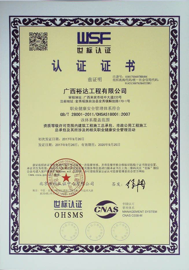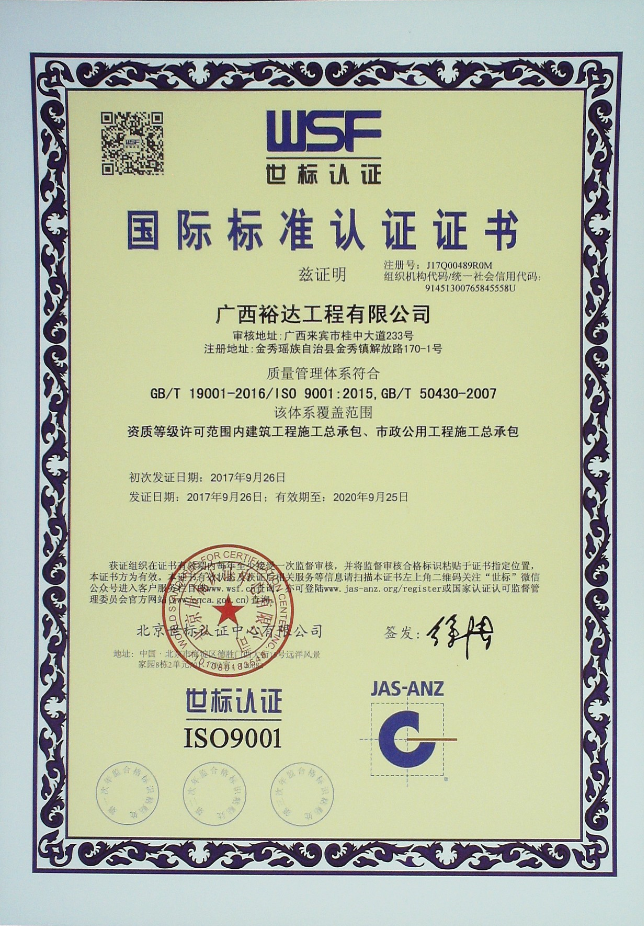 2017年9月7日至16日,經(jīng)過專家組兩輪現(xiàn)場審核,廣西裕達工程有限公司順利通過了GB/T19001-2016《質(zhì)量管理體系》、GB/T24001-2016《環(huán)境管理體系》、GB/T28001—2011《職業(yè)健康安全管理體系》、GB/T50430-2007《工程建設(shè)施工企業(yè)質(zhì)量管理規(guī)范》三標一體的認證,并于2017年9月26日獲得由北京世標認證中心有限公司頒發(fā)的ISO9001:2015、GB/T50430-2007、ISO14001:2015和GB/T 28001-2011的認證證書。