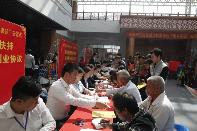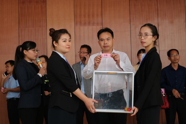 在工人員宣讀抽簽分房流程后,開始抽簽分房。首先由各鄉(xiāng)鎮(zhèn)領(lǐng)導(dǎo)代表以鄉(xiāng)鎮(zhèn)為單位抽簽確定貧困戶選房順序,再由貧困戶逐戶進(jìn)行抽簽選房并確認(rèn)。當(dāng)天,經(jīng)過核驗(yàn)材料、抽房號、登記信息、簽訂合同等一系列程序后,參加此次來賓市興賓區(qū)易地扶貧搬遷“老鄉(xiāng)家園”安置點(diǎn)分房儀式的455戶貧困戶,除36戶因材料核驗(yàn)未通過外,419戶都抽到了新房。除抽簽分房外,當(dāng)天,就業(yè)服務(wù)中心還與每戶貧困戶簽訂了就業(yè)培訓(xùn)協(xié)議,興賓區(qū)工管委領(lǐng)導(dǎo)與貧困戶簽訂幫扶協(xié)議。