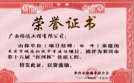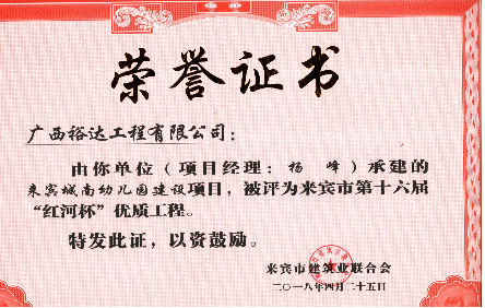 近期,從來賓市建筑業(yè)聯(lián)合會傳來喜訊,廣西裕達工程有限公司承建的“來賓城南幼兒園建設(shè)項目”“來賓市城南初級中學建設(shè)項目”“來賓飛龍小學建設(shè)項目工程總承包”“裕達·金碧天譽B區(qū)17#樓”和“裕達·金碧天譽B區(qū)18#樓”共5項工程項目被評為來賓市第十六屆“紅河杯”優(yōu)質(zhì)工程,這是繼2011年至2017年榮獲的25項“紅河杯”優(yōu)質(zhì)工程之后,再獲此榮譽。