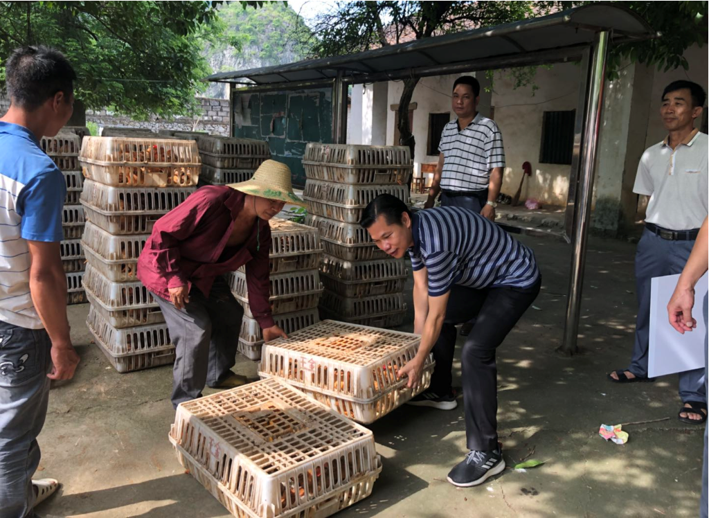 在大本村中心小學(xué)的樹蔭腳下,市政府與來賓裕達(dá)慈善基金會(huì)舉辦了社會(huì)扶貧雞苗捐贈(zèng)發(fā)放儀式,我集團(tuán)梁鋒副總裁代表來賓裕達(dá)慈善基金會(huì)為貧困戶發(fā)放近萬只價(jià)值約6萬元的