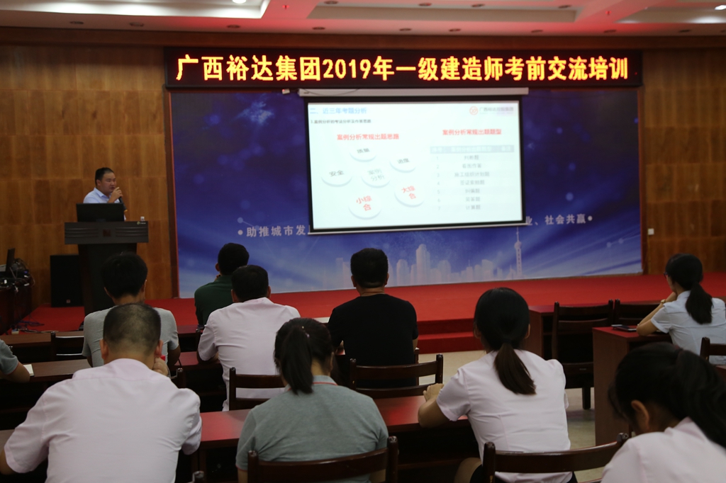 為全面貫徹裕達(dá)集團(tuán)“育人才”的經(jīng)營指導(dǎo)思想,幫助考生做好考前復(fù)習(xí)準(zhǔn)備,全力以赴做好備考。集團(tuán)人力資源部特邀請地產(chǎn)八公司副總經(jīng)理胡斌、廣西裕達(dá)工程有限公司副總工程師左居頑兩位講師進(jìn)行考試經(jīng)驗(yàn)分享以及考前培訓(xùn)指導(dǎo),培訓(xùn)內(nèi)容包含建筑、市政兩個(gè)專業(yè)全科目。培訓(xùn)于8月20日晚上19點(diǎn)在集團(tuán)七樓大會(huì)議室順利開展,共有30人已報(bào)名9月一級(jí)建造師考試的員工參加了本次培訓(xùn)。