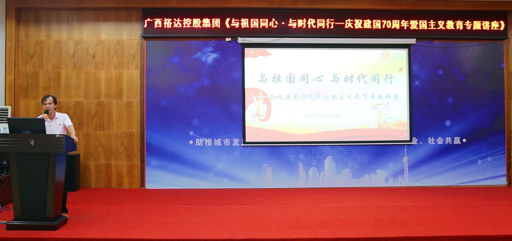 2019年是新中國成立70周年,也是集團(tuán)公司成立15周年,在祖國70歲誕辰即將到來之際,為加強(qiáng)集團(tuán)員工愛國愛黨精神文明建設(shè),加強(qiáng)集團(tuán)黨員思想政治建設(shè),充分發(fā)揮黨建引領(lǐng)作用,2019年9月17日晚7點(diǎn)集團(tuán)黨支部、來賓市興賓區(qū)城北街道黨工委聯(lián)合邀請(qǐng)來賓市黨校羅克良副教授到集團(tuán)公司開展“與祖國同心.與時(shí)代同行”慶祝建國70周年愛國主義教育專題講座,集團(tuán)副總裁喬景坤、集團(tuán)行政總監(jiān)黃玲艷、集團(tuán)黨支部書記謝家偉及支部黨員、預(yù)備黨員、集團(tuán)總部各中心、各公司主管級(jí)及以上人員200多人參加活動(dòng),異地子分公司視頻參訓(xùn),城北街道黨工委組織干事盧玉妮受邀參加活動(dòng)。