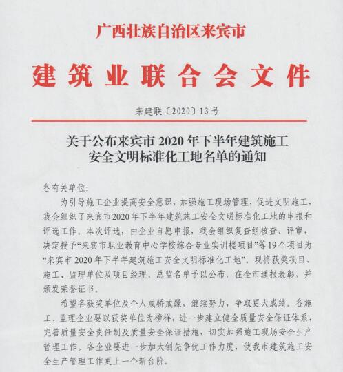 12月15日,從來賓市建筑業(yè)聯(lián)合會傳來喜訊,裕達(dá)工程的來賓職業(yè)教育中心學(xué)校綜合專業(yè)實訓(xùn)樓項目、象州縣華錦公館等共6個項目被評為來賓市2020年下半年安全文明標(biāo)準(zhǔn)化工地,以及裕達(dá)工程的中國移動廣西公司來賓綜合業(yè)務(wù)接入機房工程、裕達(dá)天悅城·錦繡花園9#、10#、11#樓及地下室等共7個項目被評為來賓市建設(shè)工程優(yōu)質(zhì)結(jié)構(gòu)獎。