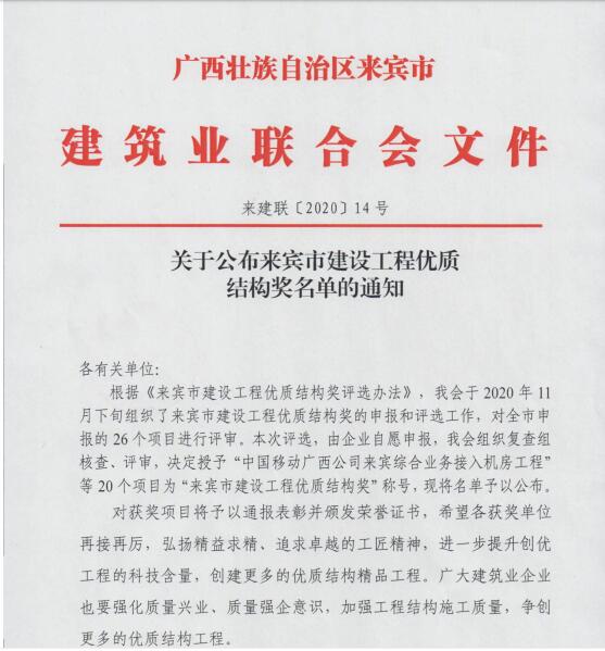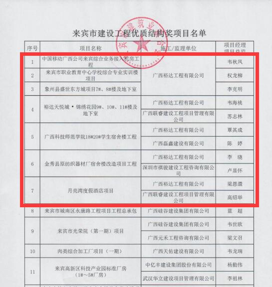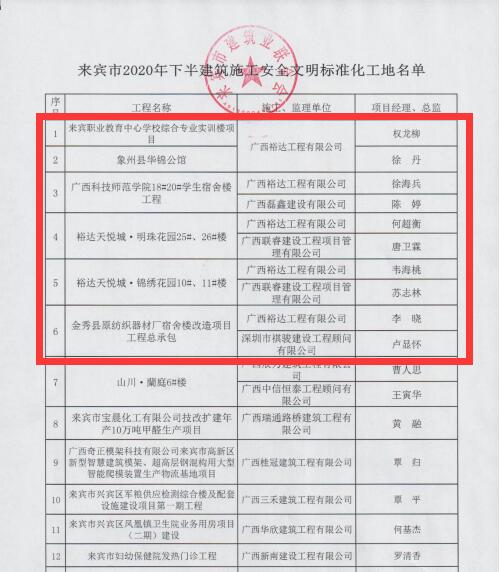 2020年下半年,共有19個項目被評為來賓市2020年下半年來賓市安全文明標(biāo)準(zhǔn)化工地,其中,裕達(dá)工程獲評6項,分別為:來賓職業(yè)教育中心學(xué)校綜合專業(yè)實訓(xùn)樓項目、象州縣華錦公館、廣西科技師范學(xué)院18#20#學(xué)生宿舍樓工程、裕達(dá)天悅城·明珠花園25#、26#樓、裕達(dá)天悅城·錦繡花園10#、11#樓和金秀縣原紡織器材廠宿舍樓改造項目工程。今年,是來賓首屆評比建設(shè)工程優(yōu)質(zhì)結(jié)構(gòu)獎,全市共有26個項目申請參評,最后有20個項目獲評,其中,裕達(dá)工程喜獲7個項目,分別為:中國移動廣西公司來賓綜合業(yè)務(wù)接入機房工程、來賓職業(yè)教育中心學(xué)校綜合專業(yè)實訓(xùn)樓項目、象州縣盛世東方城項目7#8#樓及地下室、裕達(dá)天悅城·錦繡花園9#、10#、11#樓及地下室、廣西科技師范學(xué)院18#20#學(xué)生宿舍樓工程、金秀縣原紡織器材廠宿舍樓改造項目工程和月亮彎度假酒店項目。