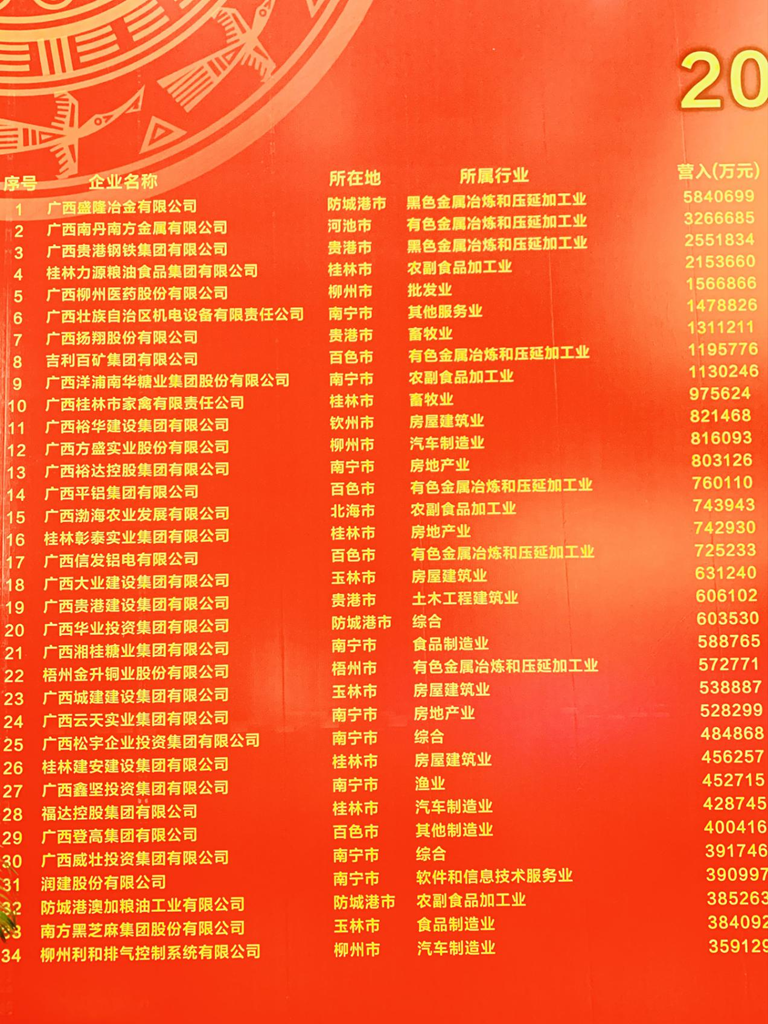 廣西壯族自治區(qū)黨委統(tǒng)戰(zhàn)部副部長、自治區(qū)工商聯(lián)黨組書記盧能干表示:發(fā)布2021廣西民營企業(yè)100強(qiáng)榜單,是為了總結(jié)成績、比較發(fā)展、樹立榜樣,進(jìn)一步引導(dǎo)、激勵、促進(jìn)廣西民營企業(yè)健康發(fā)展。會上發(fā)布了《2021廣西民營企業(yè)100強(qiáng)調(diào)研分析報告》,公布了2021廣西民營企業(yè)100強(qiáng)、制造業(yè)100強(qiáng)、2021廣西民營企業(yè)納稅10強(qiáng)、最具競爭力、最具潛力民營企業(yè)榜單。并為入圍企業(yè)頒發(fā)榮譽(yù)證書進(jìn)行表彰,裕達(dá)控股集團(tuán)以803126萬元的營業(yè)收入榮獲2021年廣西民營企業(yè)第13強(qiáng)!