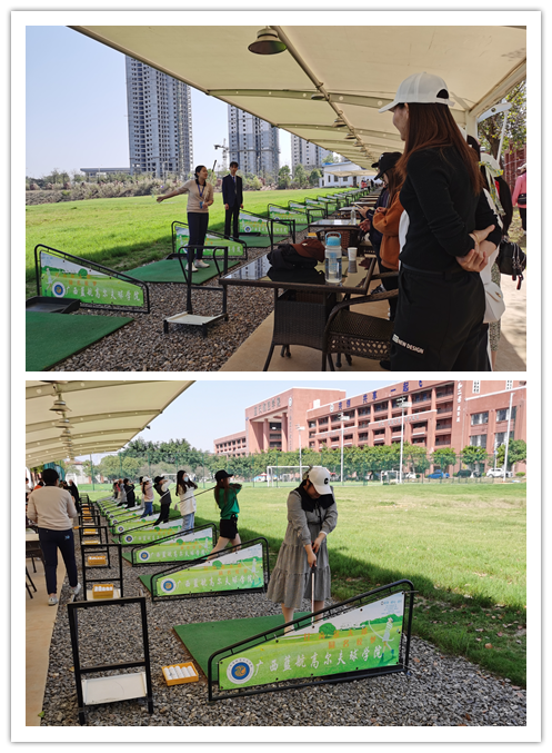 “雙腳站平,腰背挺直,分“三點”走,目光注視高爾夫球…”,專業(yè)高爾夫教練從站姿、握桿、發(fā)力點等幾大基礎知識教女員工們?nèi)胧郑俳?jīng)過教練的專業(yè)指導與動作矯正,大家漸漸有了專業(yè)高爾夫選手的姿態(tài),“這個姿勢漂亮”“力度到位”“收桿標準” ........這些贊美詞不斷的從教練口中說出。