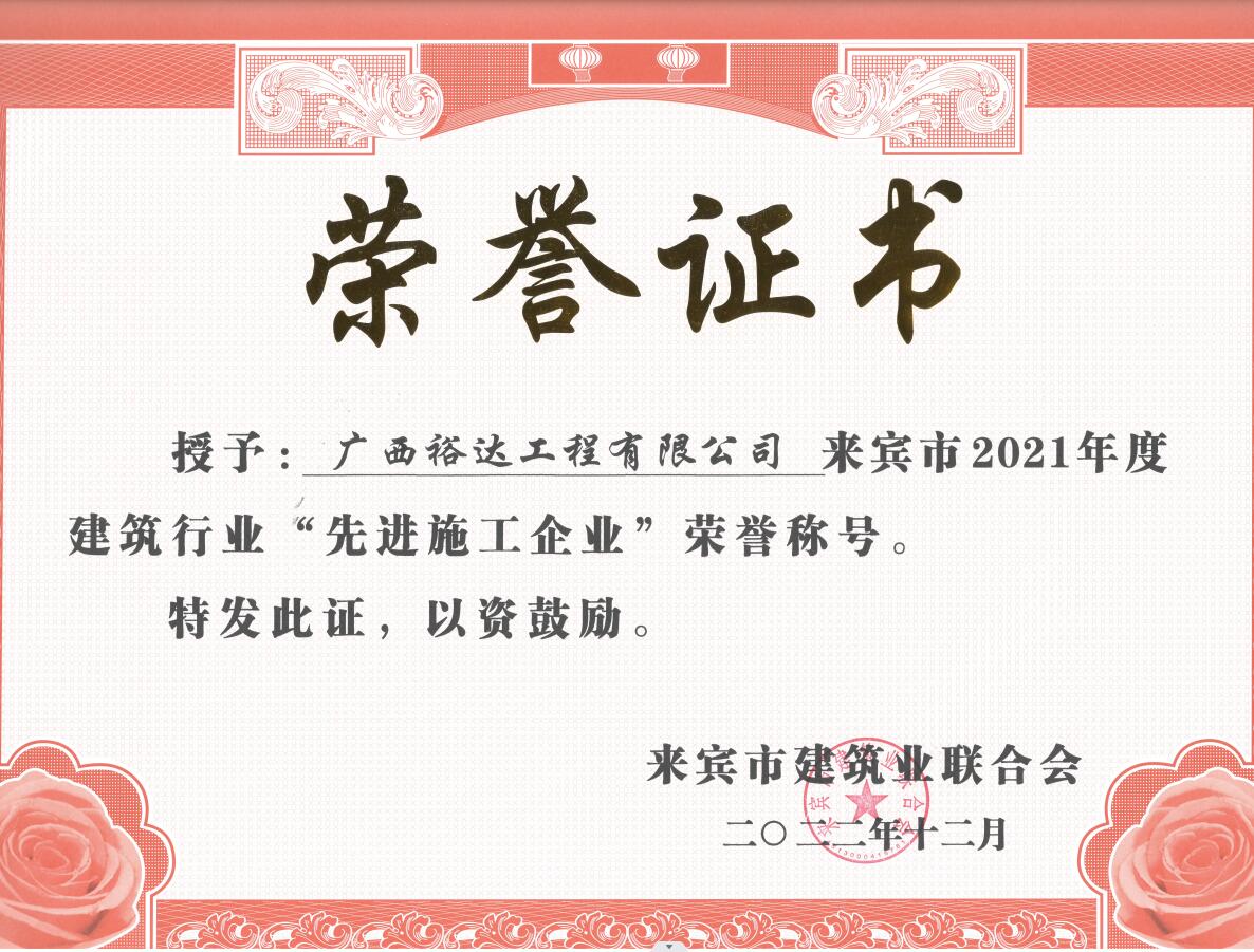 來賓市住房和城鄉(xiāng)建設(shè)局對來賓市建筑行業(yè)2021年度的先進集體和優(yōu)秀個人進行表彰,工程公司獲“來賓市建筑業(yè)先進企業(yè)”榮譽,公司總經(jīng)理權(quán)龍福還被評為“來賓市建筑業(yè)優(yōu)秀企業(yè)經(jīng)理”,公司徐海兵等8位員工被評為“來賓市建筑業(yè)優(yōu)秀建造師”;公司胡海深等8位員工被評為“來賓市建筑業(yè)優(yōu)秀安全員”。這些榮譽是公司全體員工一直以來辛勤耕耘和默默無聞奉獻的結(jié)果以及肯定,是工程公司綜合實力不斷提升和行業(yè)良好信譽的再次體現(xiàn),顯示工程公司得到社會和同行的認可,必將“裕達品牌”的影響力和競爭力提上新的臺階。