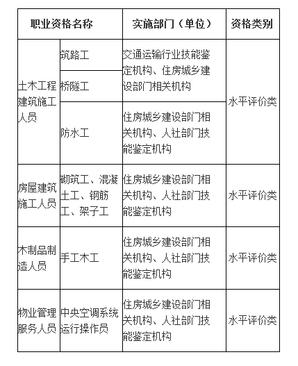 根據(jù)2017年9月人社部公布的最新版“國家職業(yè)資格目錄”,技能人員職業(yè)資格共有81項,由住建部門負責實施的有以下幾項: