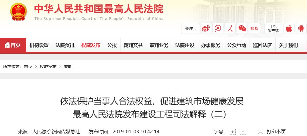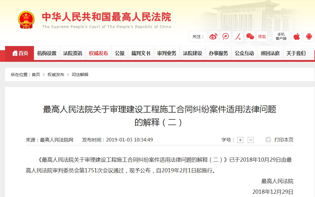 《關(guān)于審理建設(shè)工程施工合同糾紛案件適用法律問(wèn)題的解釋(二)》(以下簡(jiǎn)稱《解釋》),經(jīng)最高人民法院審判委員會(huì)第1751次會(huì)議討論通過(guò),將于2019年2月1日起施行。