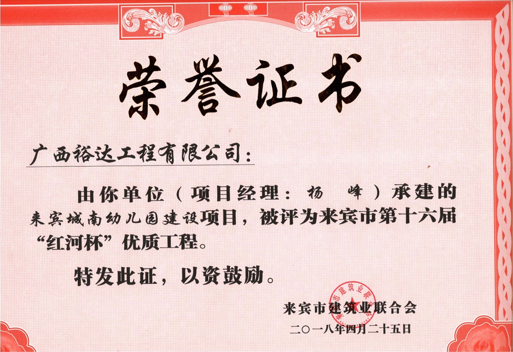 2018年來(lái)賓市第十六屆“紅河杯”優(yōu)質(zhì)工程(來(lái)賓城南幼兒園建設(shè)項(xiàng)目)
