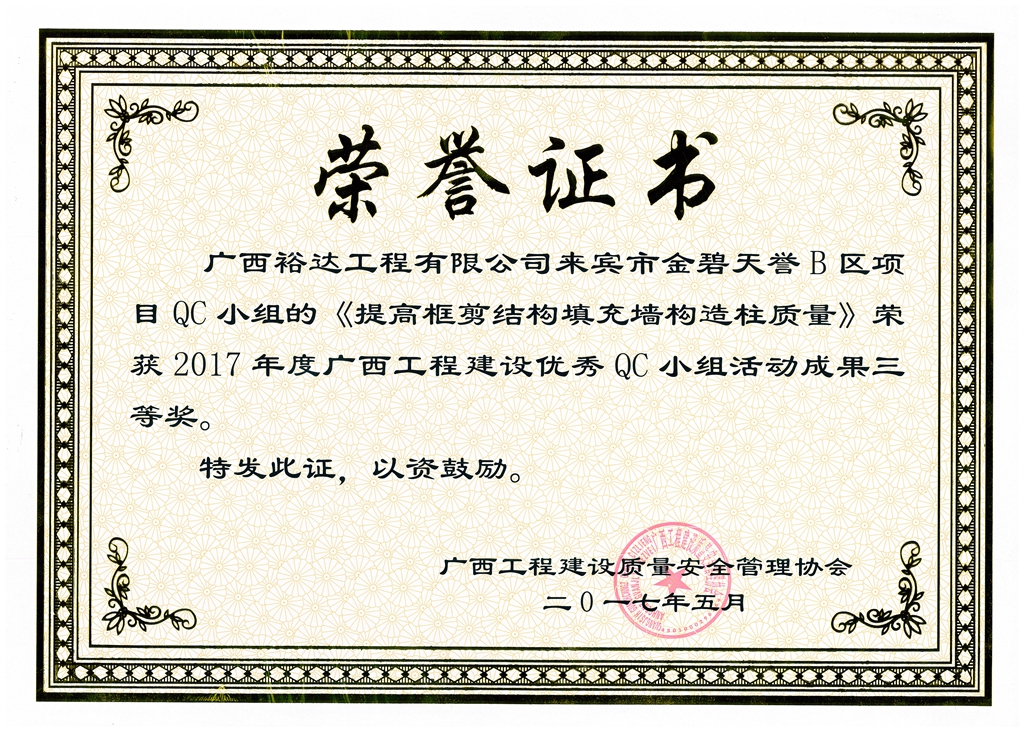 2017年廣西工程建設(shè)優(yōu)秀QC小組活動(dòng)成果三等獎(jiǎng)