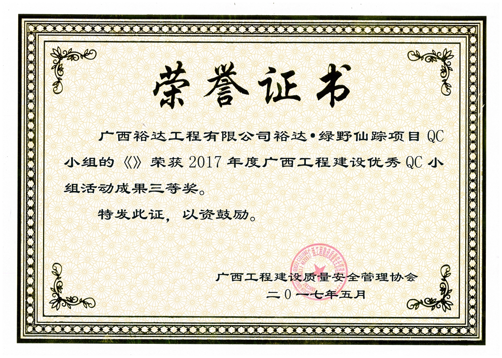 2017年廣西工程建設(shè)優(yōu)秀QC小組活動(dòng)成果三等獎(jiǎng)