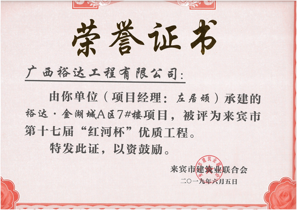 下一篇:裕達(dá)·金湖城A區(qū)1#樓項(xiàng)目評(píng)為來(lái)賓市第十七屆“紅河杯'優(yōu)質(zhì)工程(項(xiàng)目經(jīng)理:胡凌毅)