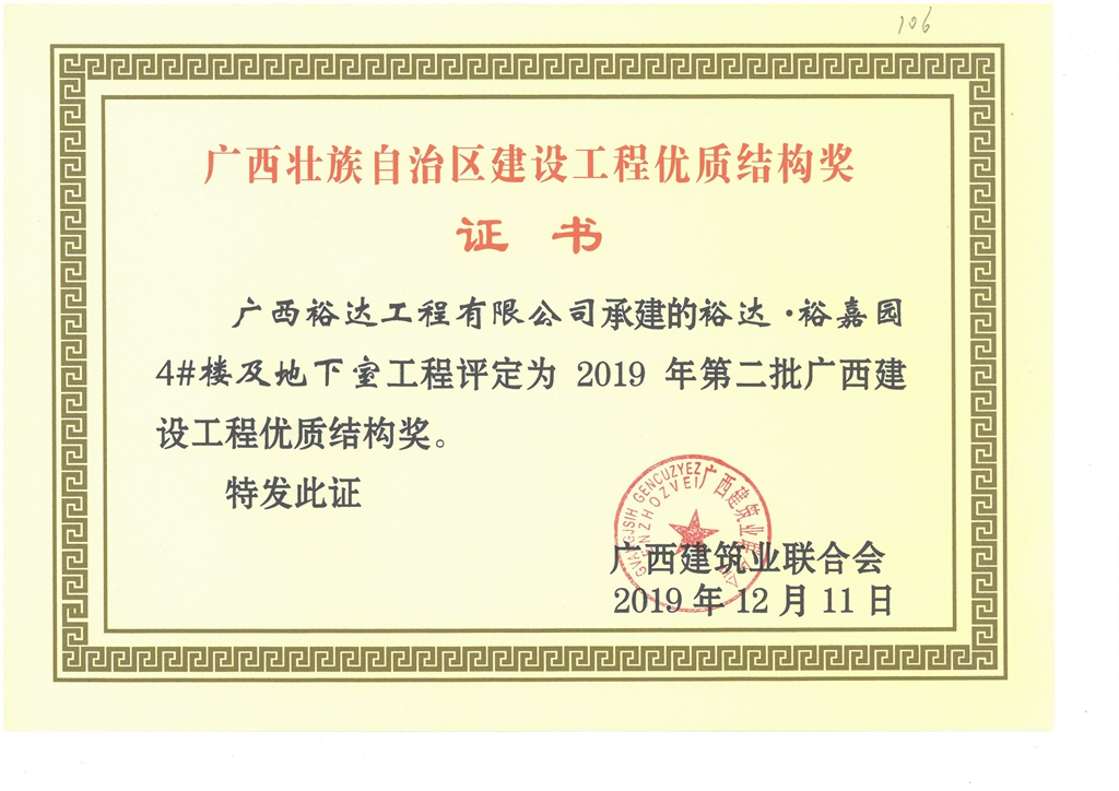 裕達(dá)·裕嘉園4#樓及地下室工程評(píng)定為2019年第二批廣西建設(shè)工程優(yōu)質(zhì)結(jié)構(gòu)獎(jiǎng)